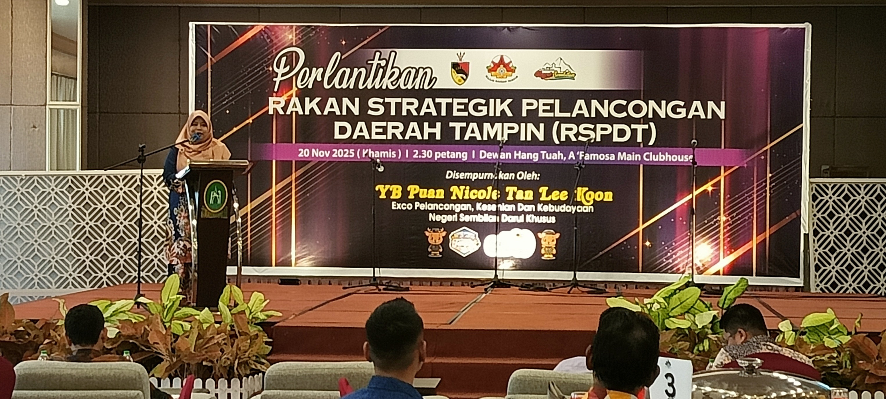 Majlis Perlantikan Rakan Strategik Pelancongan Daerah Tampin (RSPDT) telah berlangsung sebentar tadi di A Famosa Golf Resort, Melaka. Perasmian majlis ini telah disempurkan oleh Puan Suriani Binti Salihan, Yang Dipertua MDTampin. Y.B. Puan Nicole Tan Lee Koon, EXCO Kerajaan Negeri Sembilan yang sepatutnya menyempurnakan majlis perasmian ini tidak dapat hadir diatas sebab-sebab yang tidak dapat dielakkan.